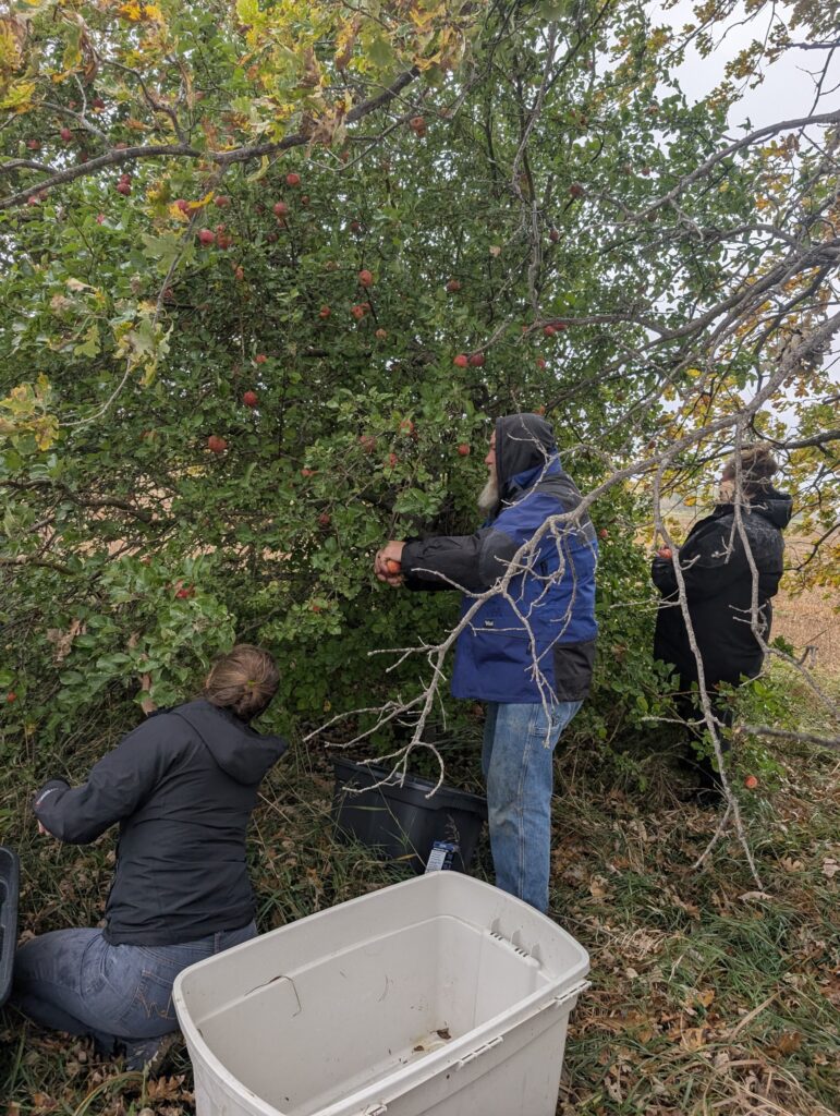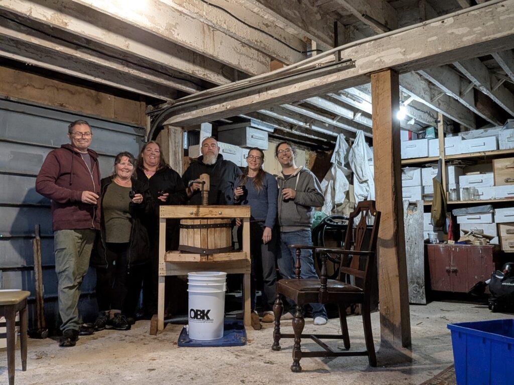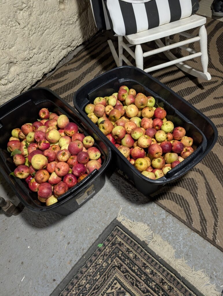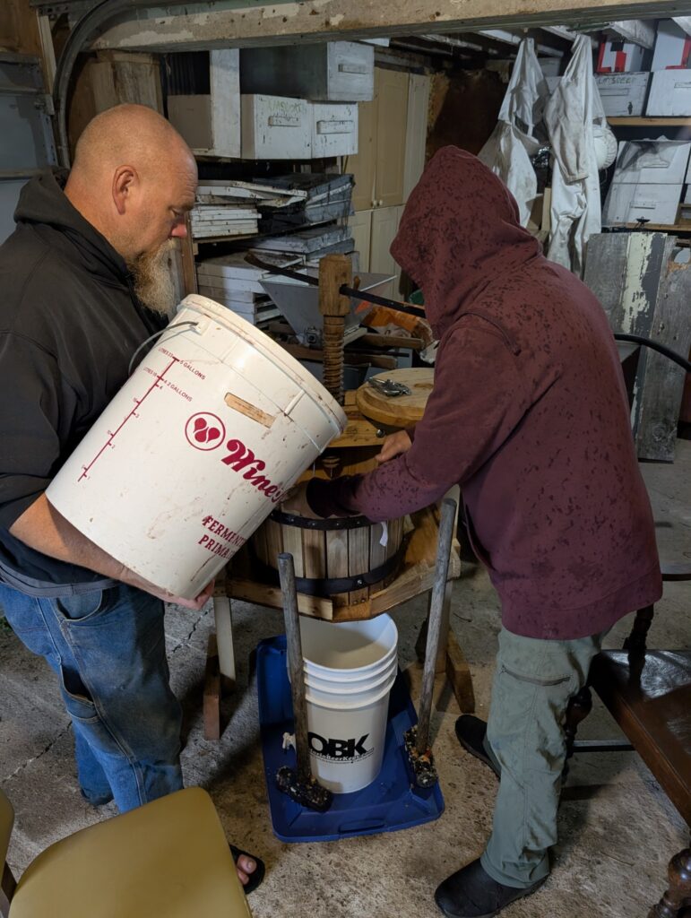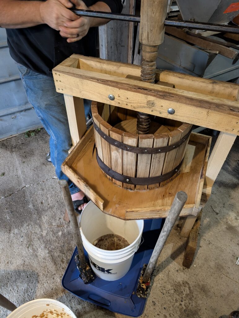 The apples were sparse this year, so we drove further than we normally would. It’s probably a good idea to take notes as to where the best apples were…maybe next year? Thanks to Penda who lead us all up and down the country sideroads in search of some good apples as well as Wulfwynne who drove the rest of the gang around. She also gave us a knife sharpening lesson (she shuddered when I showed her my knife 🙃) but apparently I was the only one in need of a lesson as Cheddar and Yngveld already knew how. While we carefully chopped up the apples, Penda and Wulfric got the apple cider press all set up. Apparently, squishing the apples with a sledgehammer works best before putting the apples in the press.