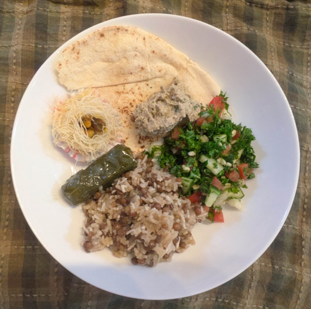 - Mujadara مجدّرة: Black/brown lentils, long grain white rice, yellow onions, olive oil, salt, black pepper, cumin and parsley (for garnish)